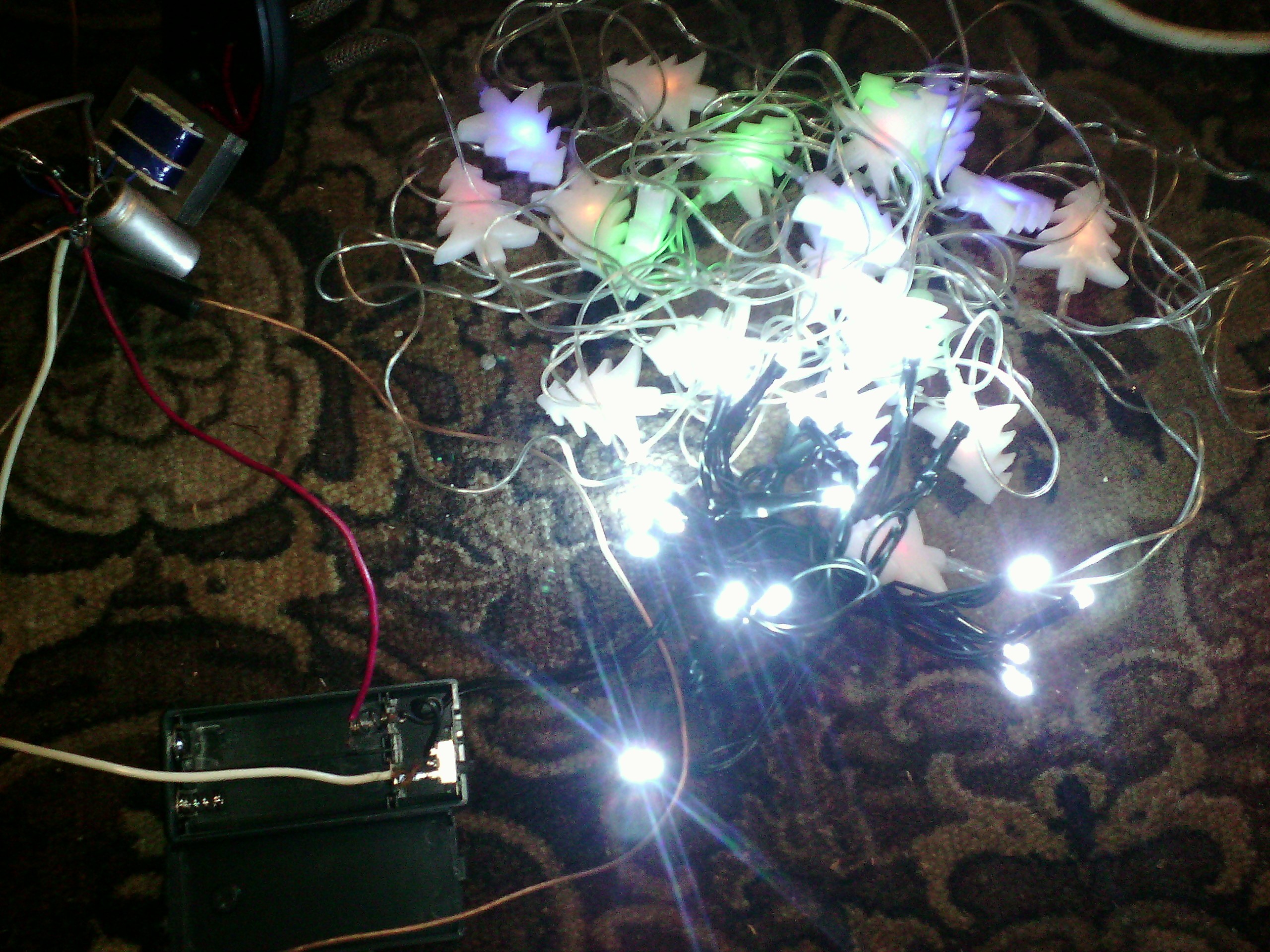Ноль фазы и землю подключаем к диоду и параллельно конденсатор. К конденсатору подключаем гирлянду ЛЭД на три вольта, которую можно купить в любом магазине новогодних игрушек. Батарейки не нужны. Гирлянда ярко загорается.